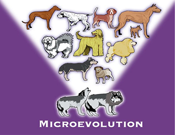 The "Dog-Wolf Family" (Canidae) is a good example of Micro-evolution. Domestic dogs came from some form of wild dog, here represented by wolves. All the variety has come from possibly one or two original kinds. Relatively small changes have occurred in things like size or color, but St. Bernards and Chihuahuas are still members of the dog family.